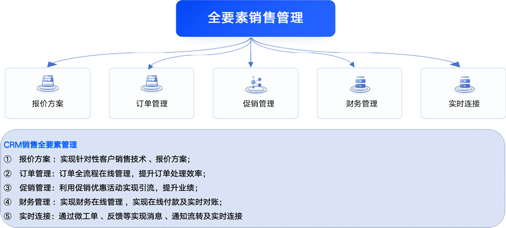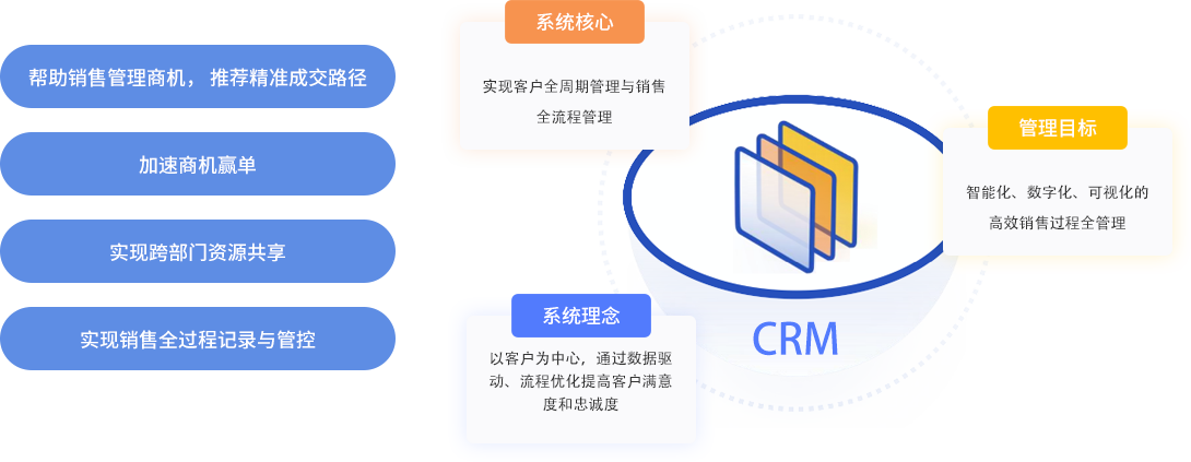 以客户为中心,打通线索至收款的端到端的销售流程,讲这些流程渗透到业务的每个环节,支撑销售团队的每个动作
